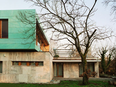 Basis des Projekts war ein eingeschossiges Flachdachgebäude aus dem Jahr 1965. Es liegt zwischen alten Bäumen auf einem zum Bodensee leicht abfallenden Ufergrundstück. Das kleinteilig gegliederte Gebäude umschließt einen nach Norden offenen Patio. Großformatige Travertin-Platten verkleiden die ehemals verputzten Aussenwände des Erdgeschoßes. Es wirkt nun wie ein massiver Sockel. Auf ihm wurde ein mit grün patiniertem Kupferblech verkleideter Kubus platziert.