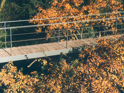 Eine schmale Brücke überspannt den Patio an seiner nördlichen offenen Seite. Über sie gelangt man vom neuen Studio mitten durch die Krone eines Baumes auf das gegenüberliegende Flachdach.