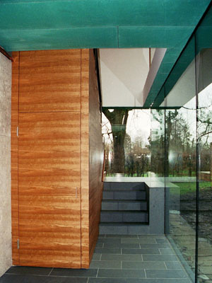 Über einen Sockel aus Stein - gefolgt von einer Treppe aus Holz - taucht man von unten in den Kubus ein.