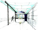 Der weisse, gerundete Baukörper steht - abgesetzt durch dunkelblaue Fugen - scheinbar frei unter dem Dach. Er öffnet sich mit dem Verkaufsschalter zum Wartebereich nach Norden.